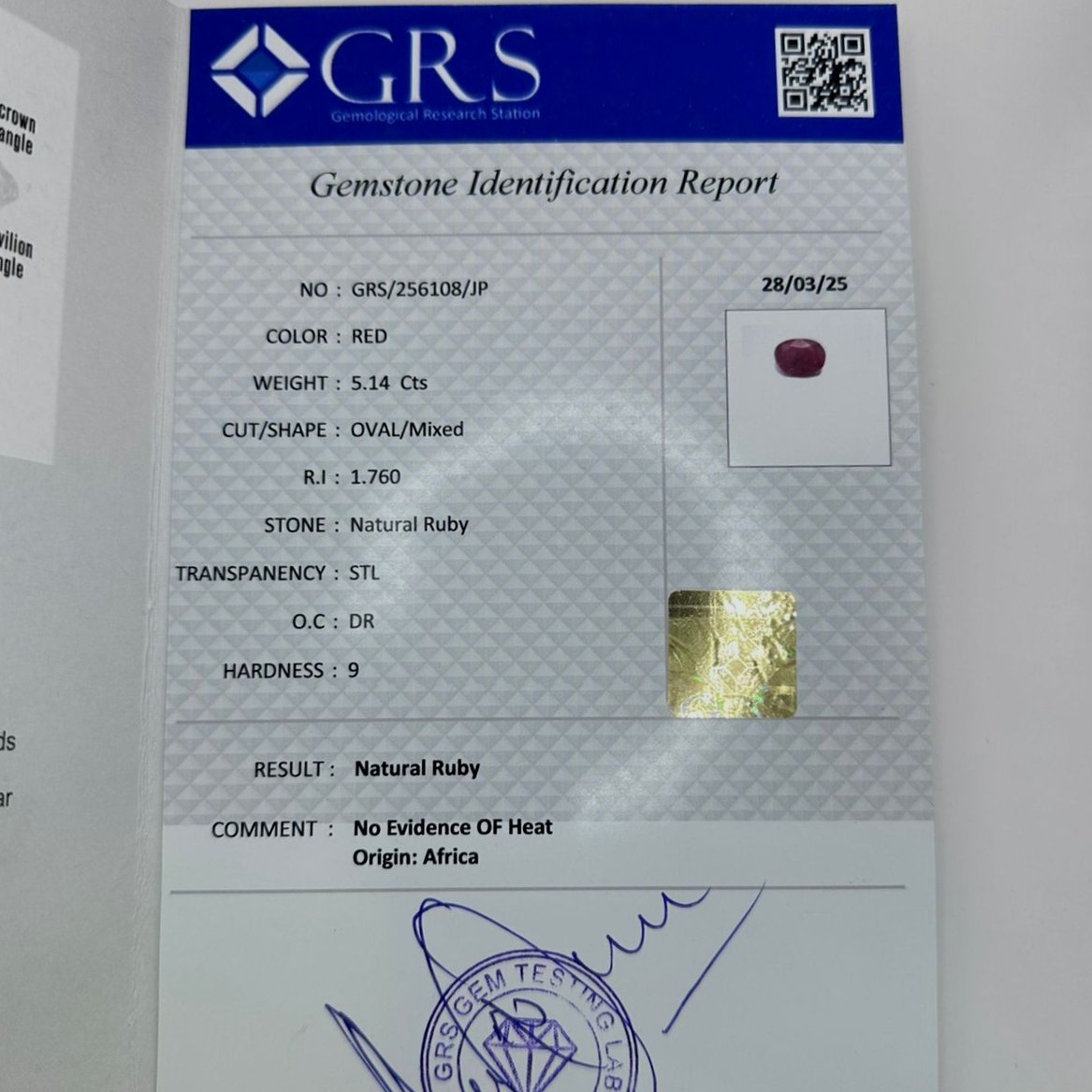 حجر ياقوت أحمر طبيعي، ياقوت 5.14 قيراط، حجر كريم بشهادة، ياقوت طبيعي معتمد، حجر كريم فاخر، مجوهرات راقية، أحجار كريمة أصلية، فحص مختبر ياقوت، حجر ياقوت فاخر، تصميم مجوهرات