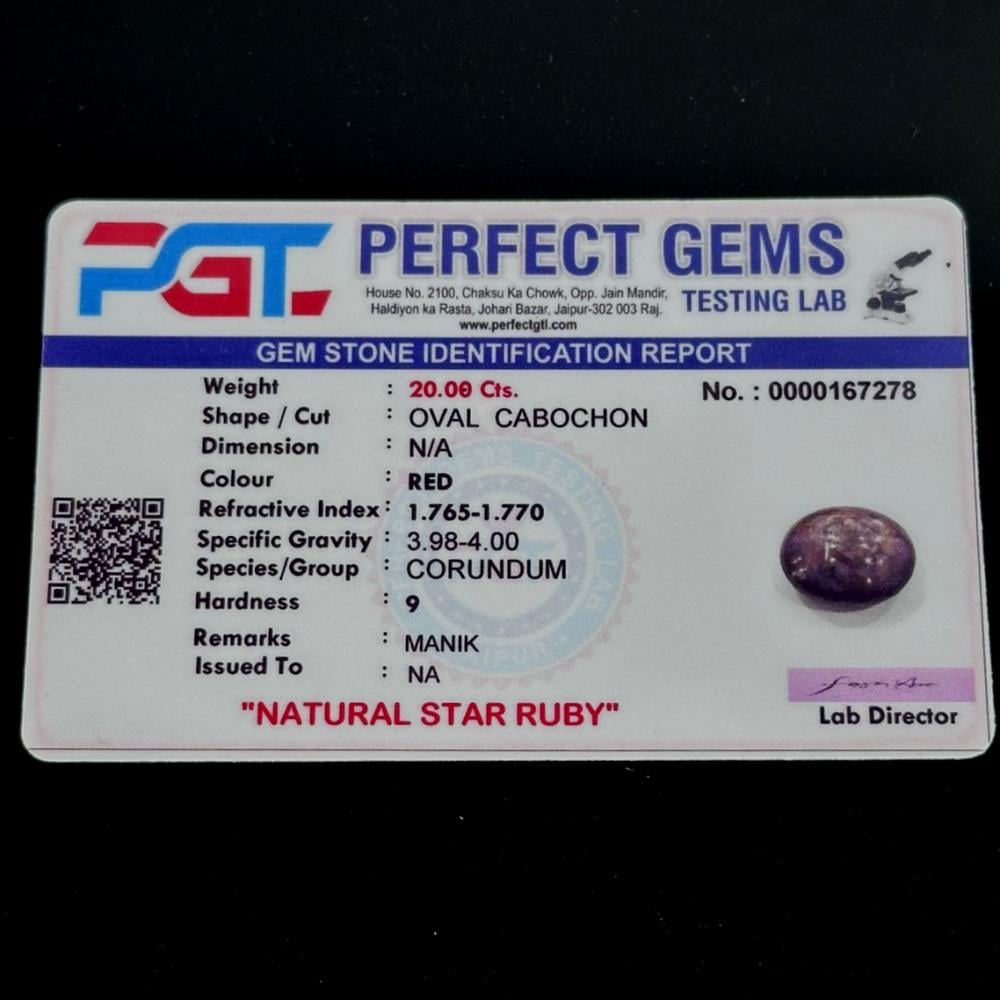 بلونه الأحمر الغني وتأثيره النجمي المميز الناتج عن انعكاس الضوء بشكل شعاعي واضح. يتم فحص الحجر بدقة في مختبر معتمد، مع شهادة رسمية تؤكد أصالته ومصدره الطبيعي وجودته العالية.