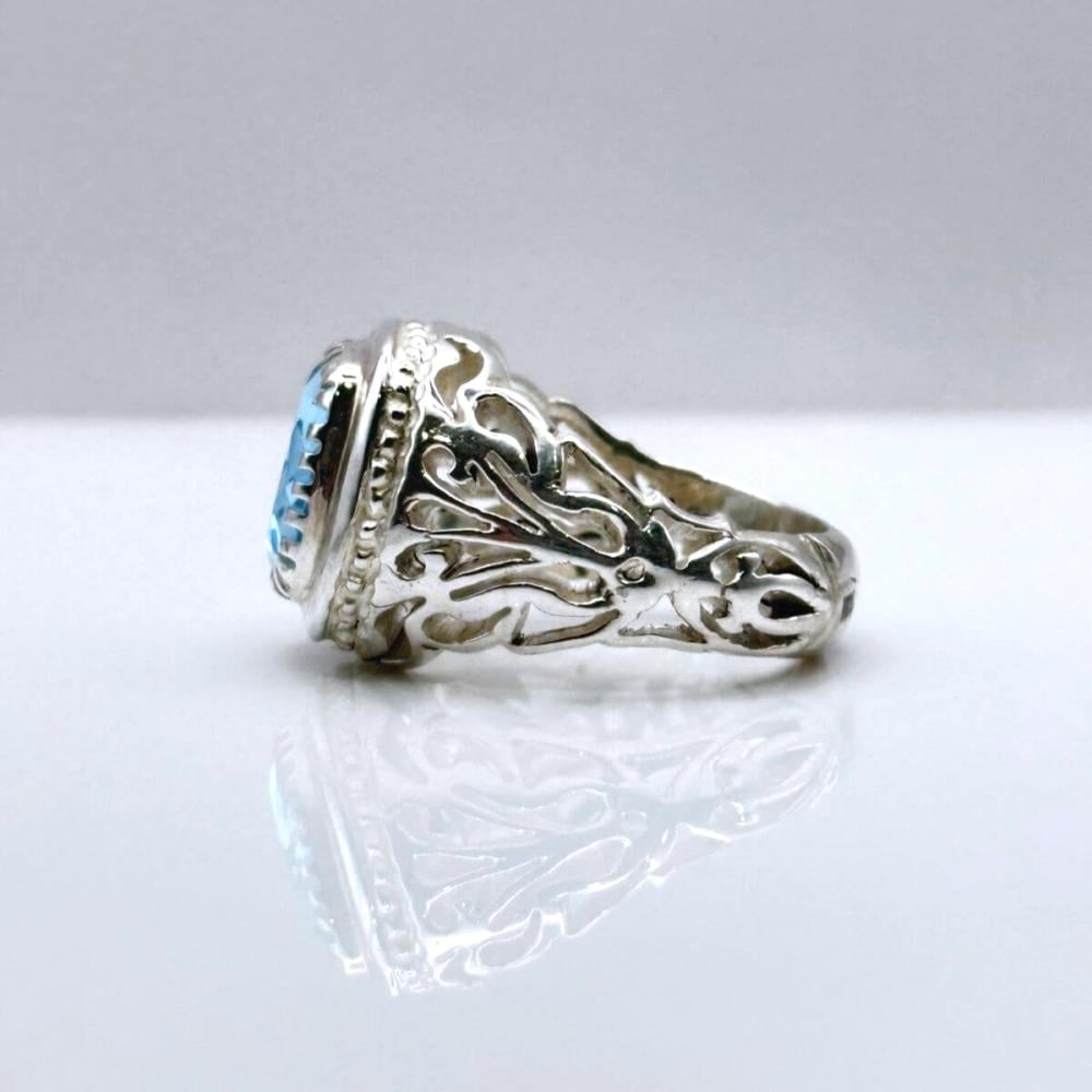 الخاتم مصاغ من فضة نقية عيار 925، بتفاصيل حفر دقيقة تبرز جمال الحجر وتُكسب القطعة طابعًا رجاليًا متوازنًا بين الجمال والقوة.