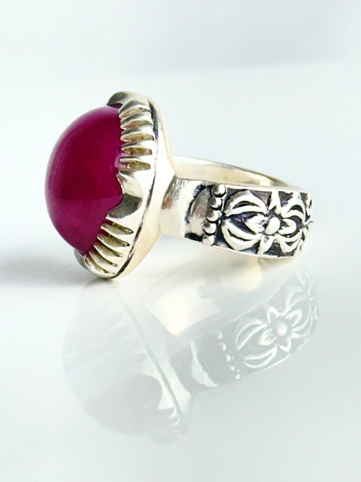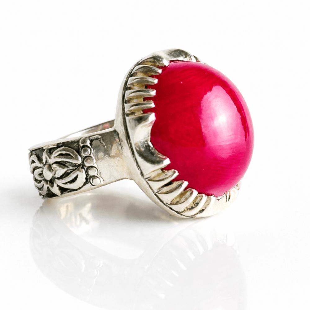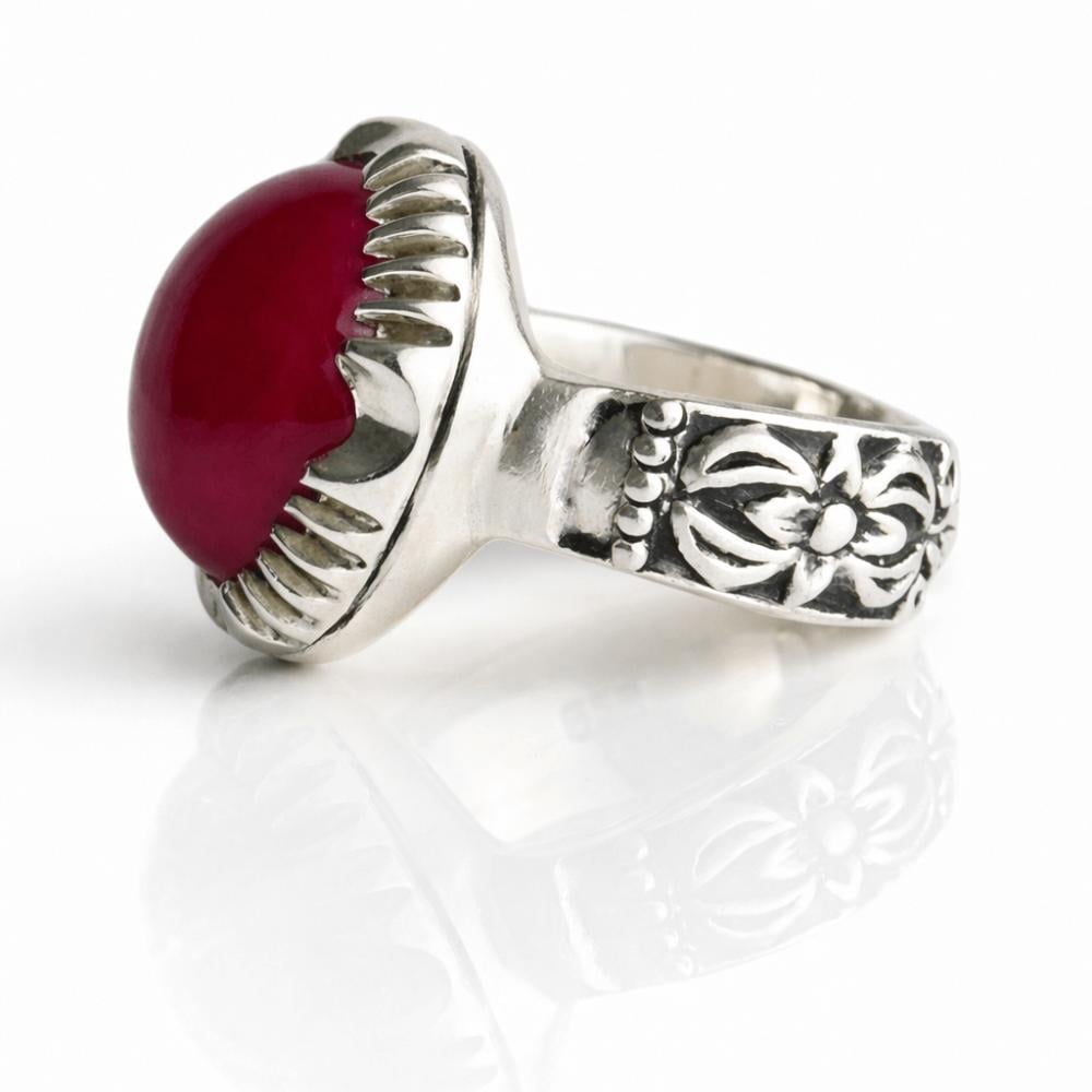 استمتع ببريق الياقوت الأحمر مع هذا الخاتم المصنوع يدويًا بأجود الصياغات.