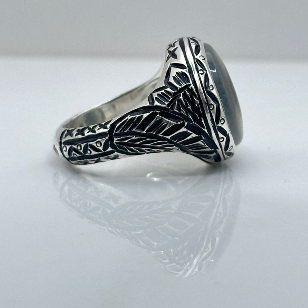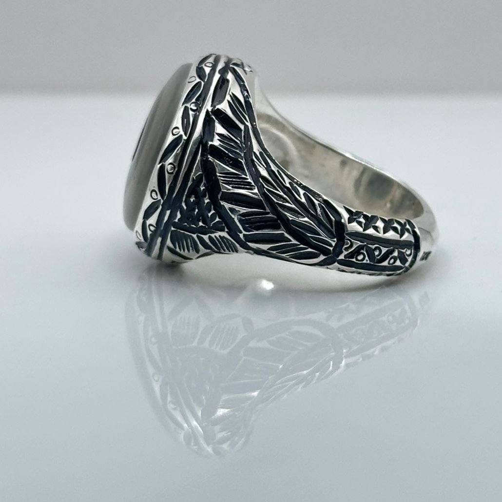 الخاتم مصاغ بإتقان على يد الصائغ "عرفان" باستخدام فضة نقية عيار 925، ويزن 18 غرام ليمنح مرتديه شعورًا بالثبات والراحة. متوفر بمقاس 9.25 أمريكي (20 عربي) ليناسب أغلب القياسات بدقة.
