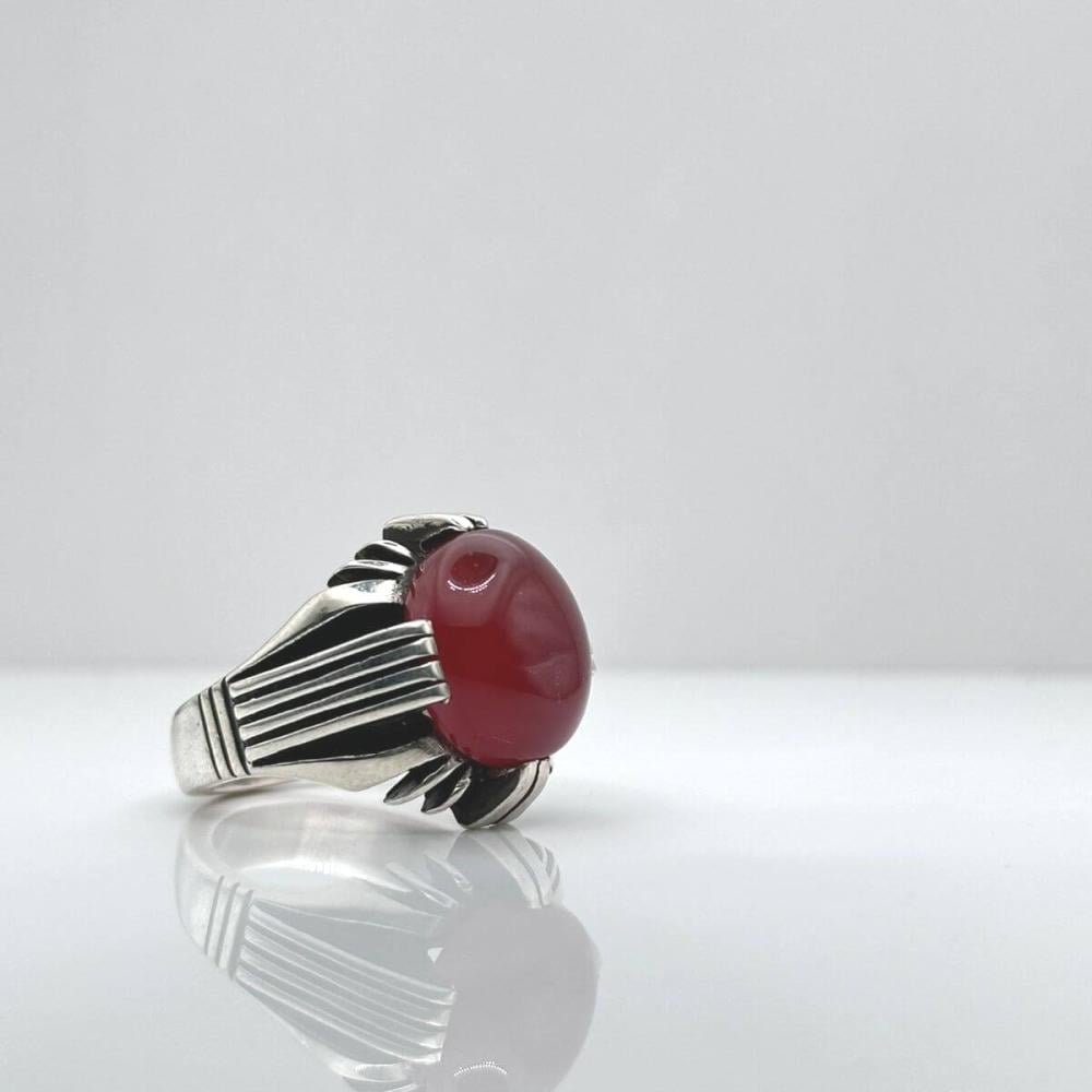 ارتقِ بإطلالتك مع خاتم العقيق اليماني الأحمر الفاخر، المصنوع بحرفية عالية ليجمع بين الأصالة والفخامة.