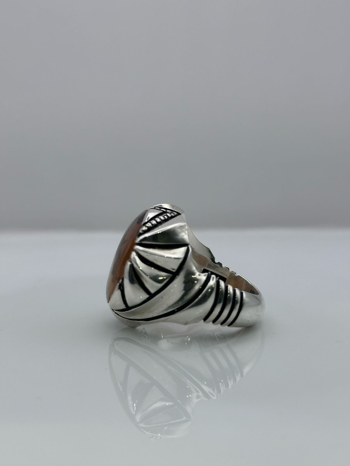 المرصع بعقيق يماني مشجر يتميز بتفاصيله الطبيعية المبهرة ونقوشه الفريدة داخل الحجر. يأتي العقيق بمقاس 20.7 × 19.4 ملم، ما يمنحه حضورًا لافتًا، يحيطه إطار مصاغ بدقة من فضة عيار 990 اللامعة، ليعكس أصالة التصميم وقوة الحضور.