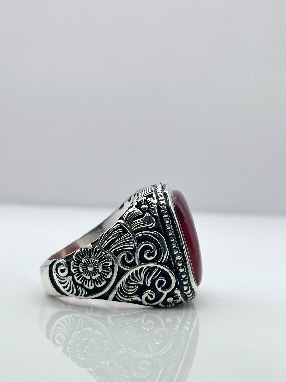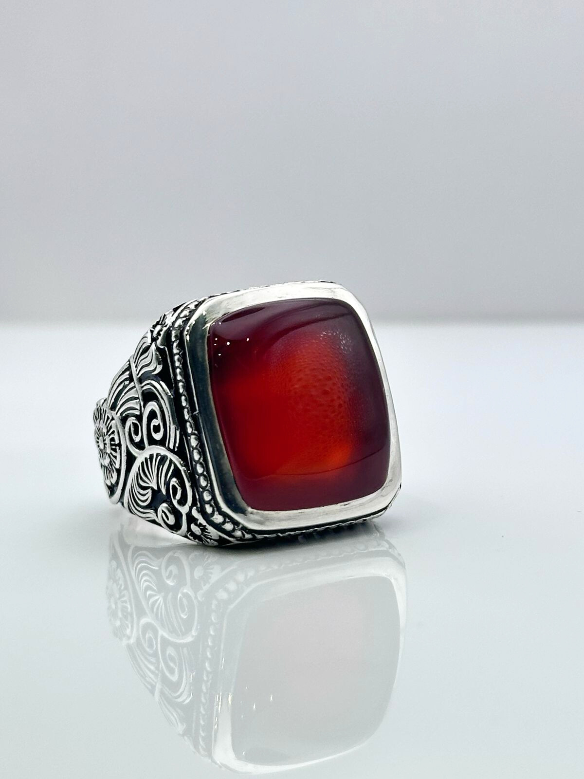 ارتقِ بإطلالتك مع هذا الخاتم الرجالي الفاخر المصنوع من العقيق اليماني الزجاجي الياقوتي،