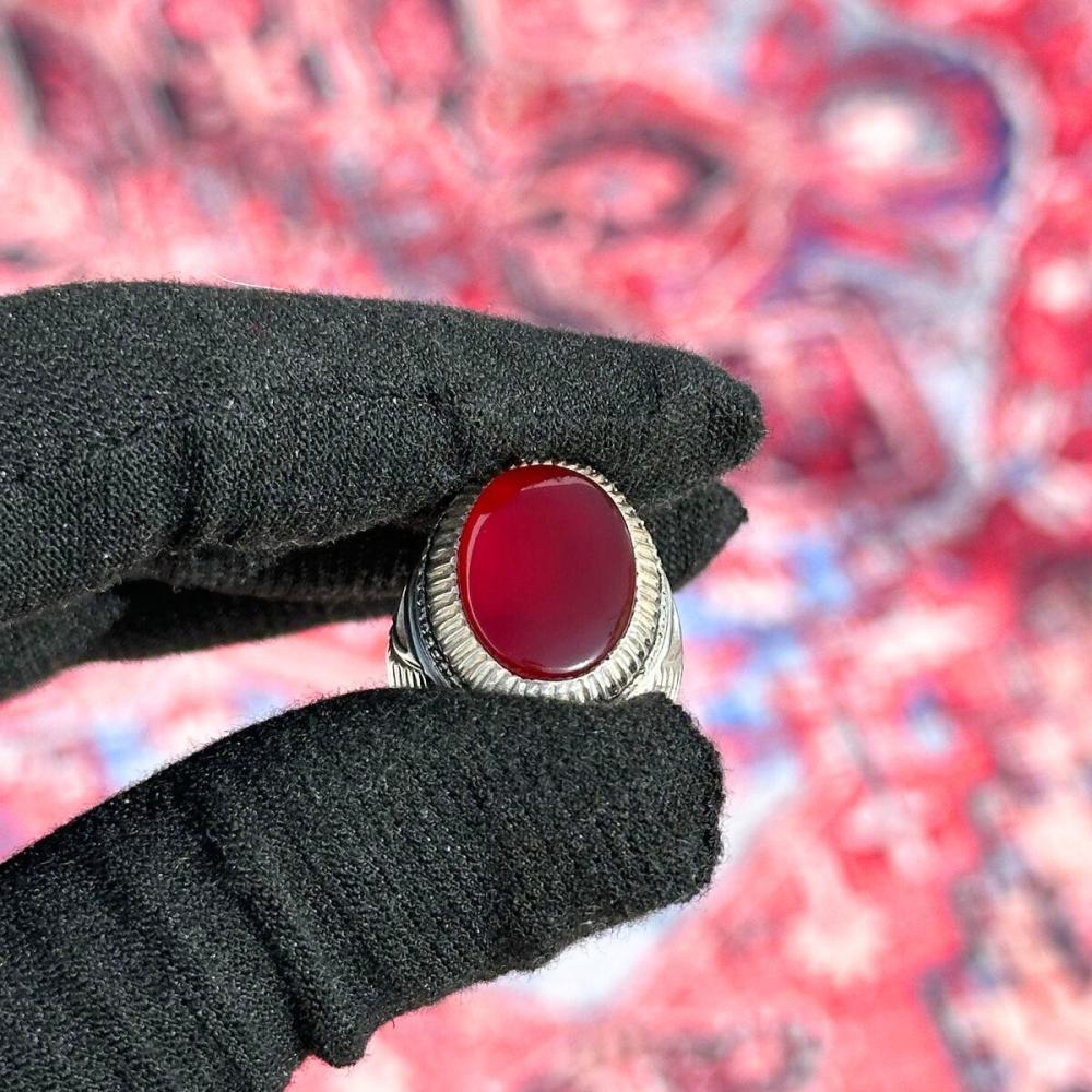 خاتم عقيق يماني ياقوتي أحمر بتفاصيل فاخرة وصياغة يدويّة احترافية بصياغة عقيل،