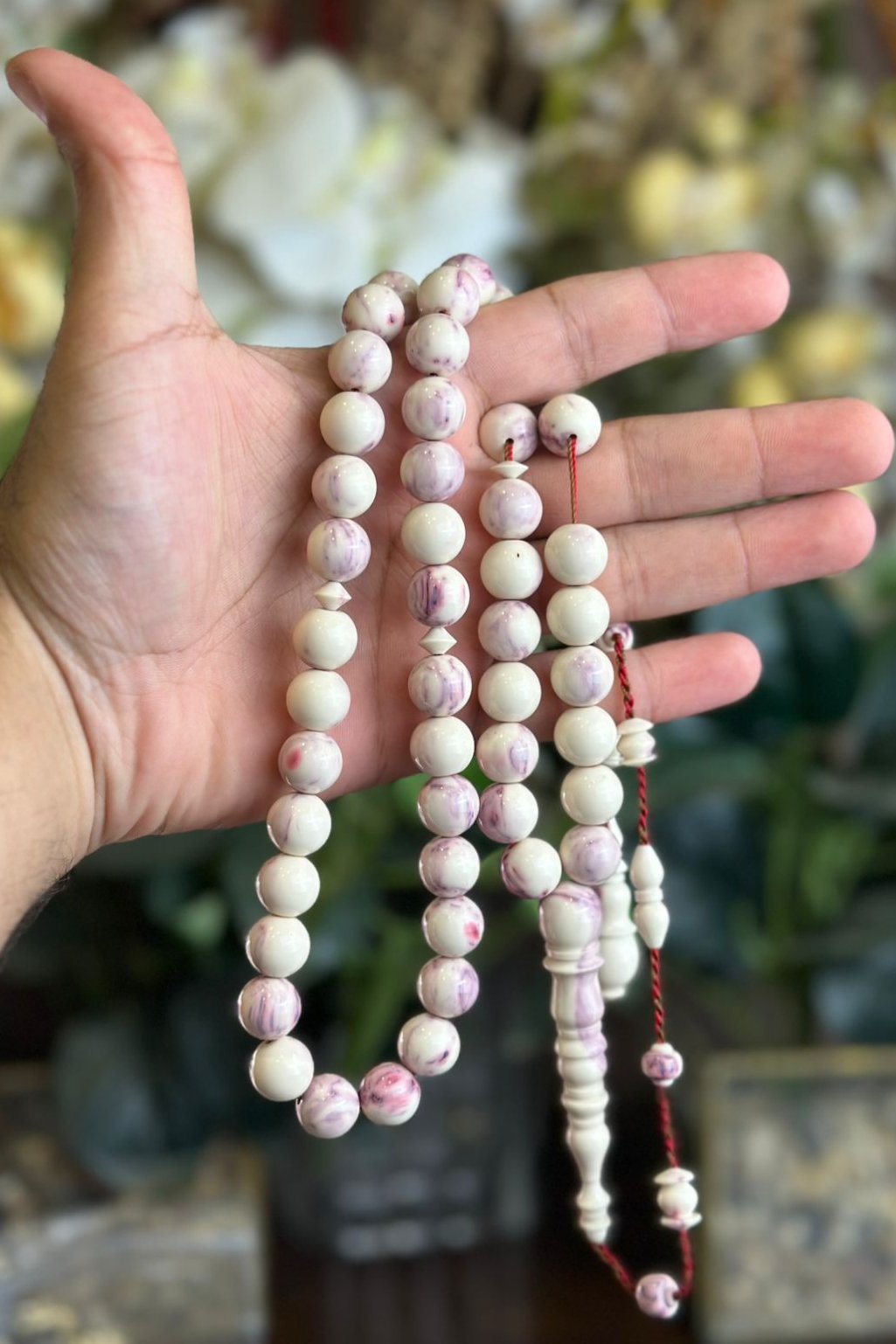 صنعت هذه السبحة بعناية يدوية في مكتبية خراطة الأسطى تيم، المشهورة بإبداعها في صناعة السبح الراقية والنادرة.