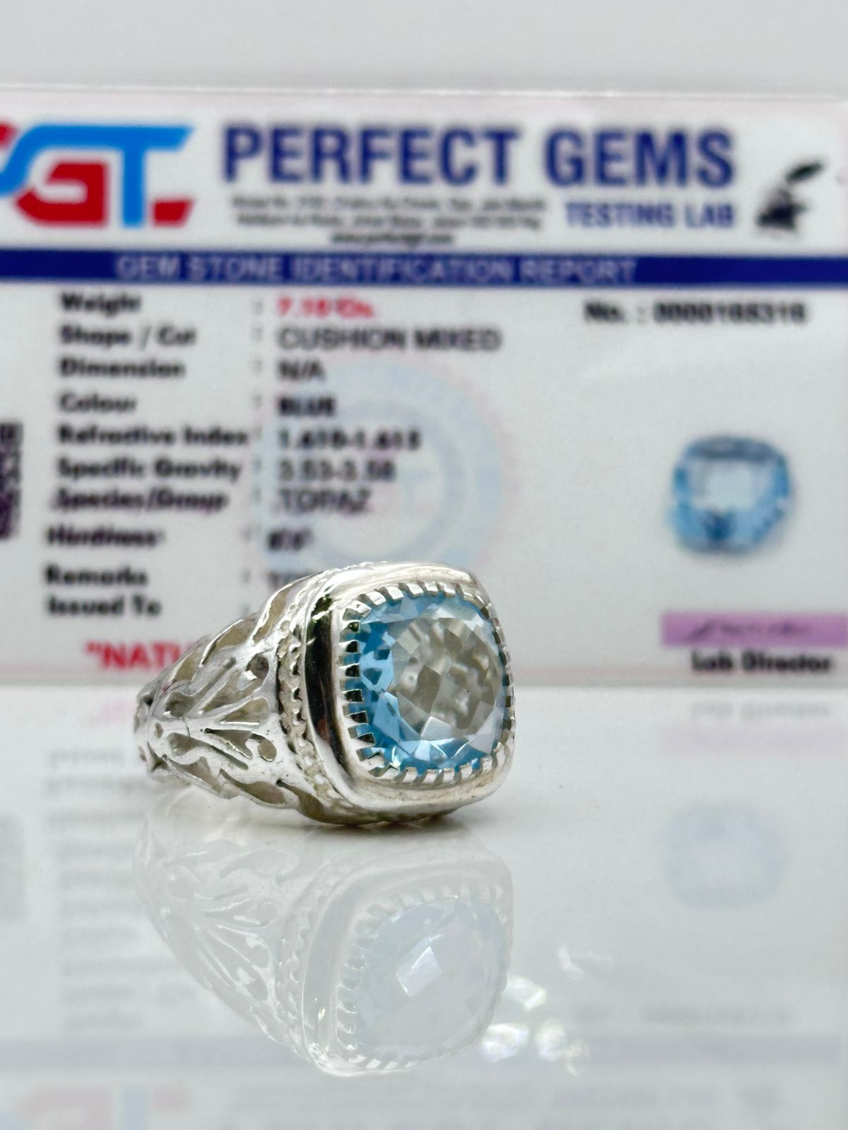 - تصميم أنيق يتميز بحجر توباز أزرق طبيعي مصقول بإتقان، يضفي بريقًا واضحًا مع قاعدة فضية متينة.