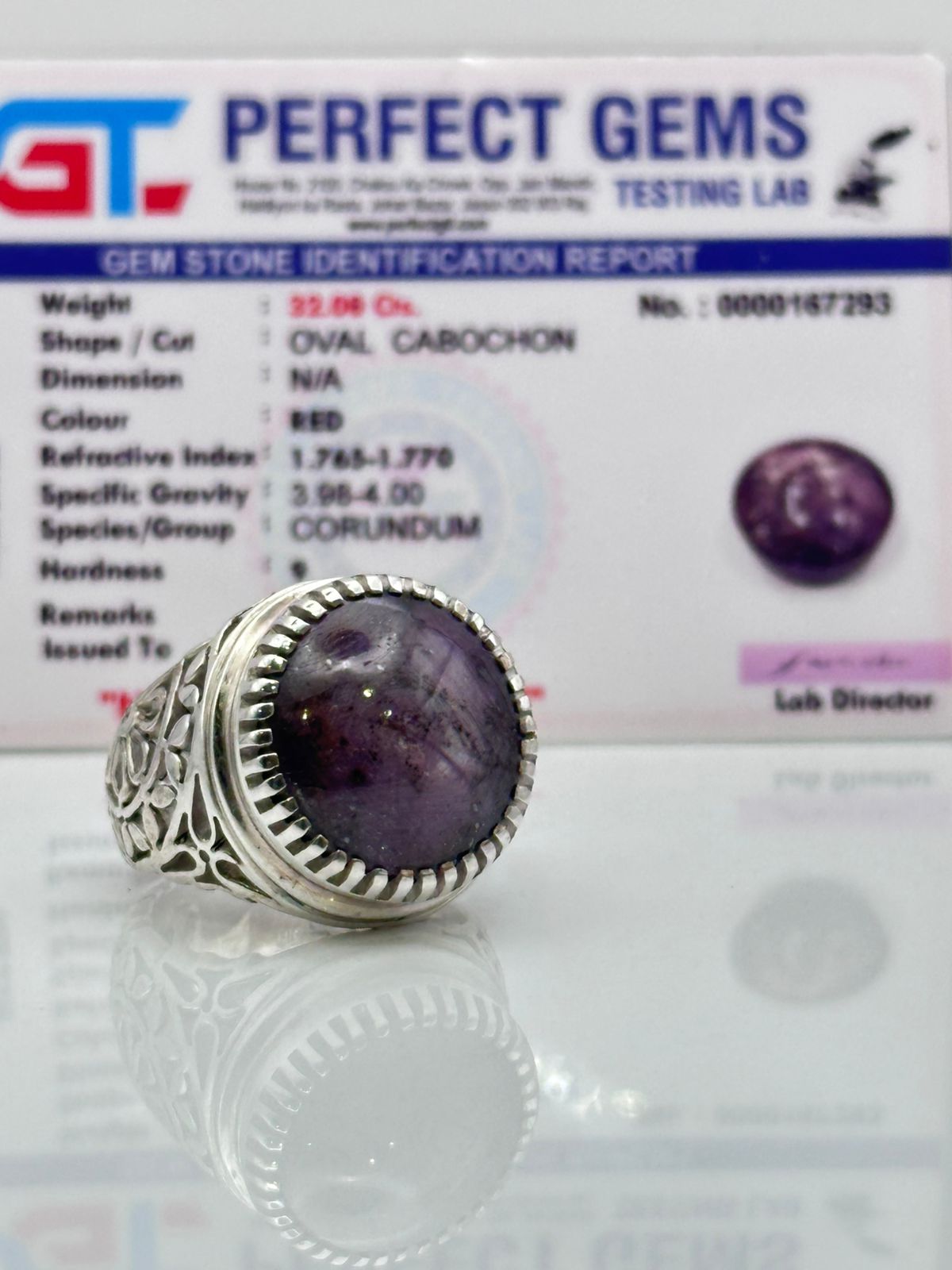 تصميم عصري يجمع بين الحزم والبساطة، مع حجر ياقوت نجمي متوسط الحجم وسط الصياغة الفضية المتقنة، مما يجعله خياراً عملياً لمختلف الأذواق.
